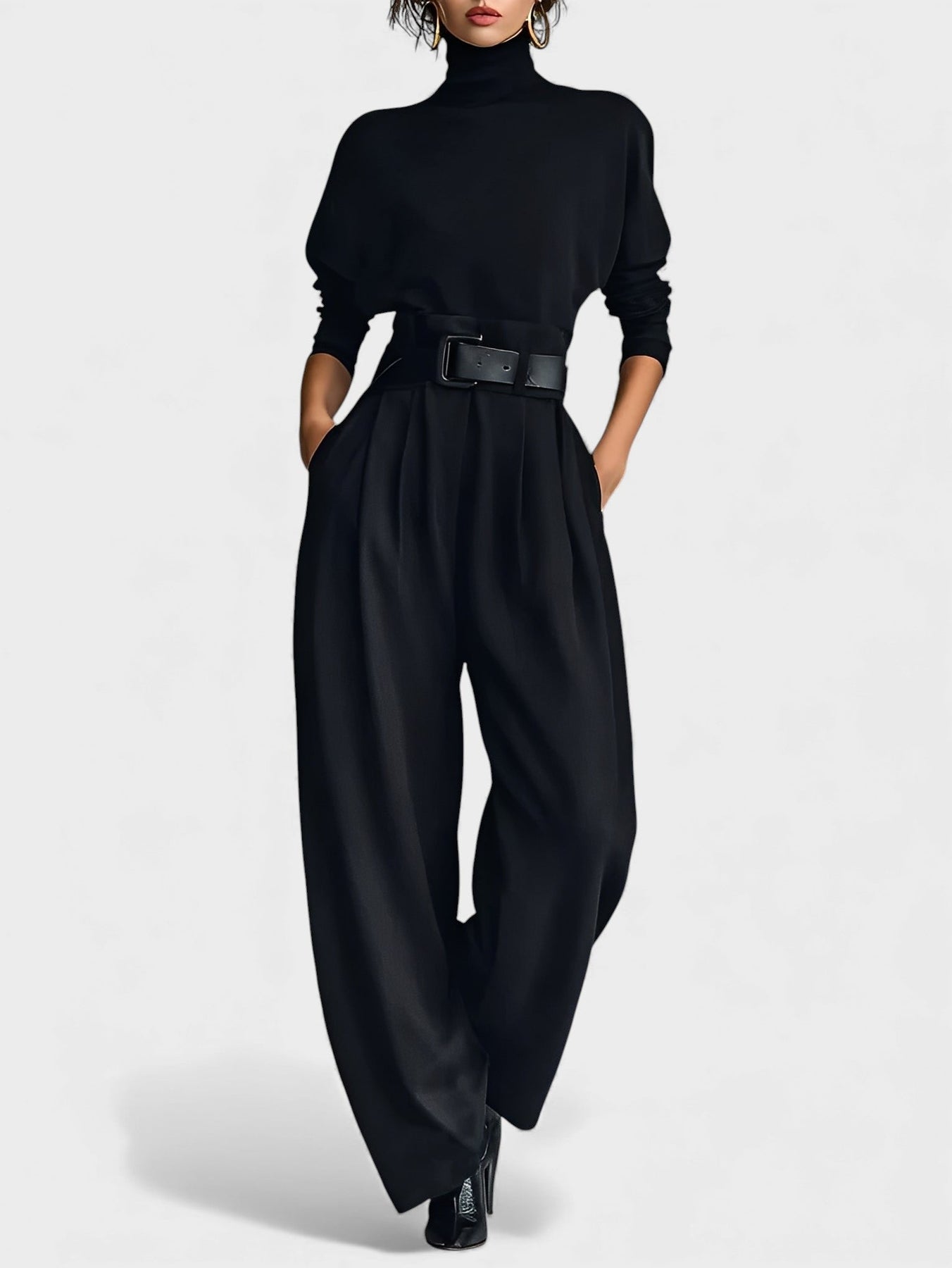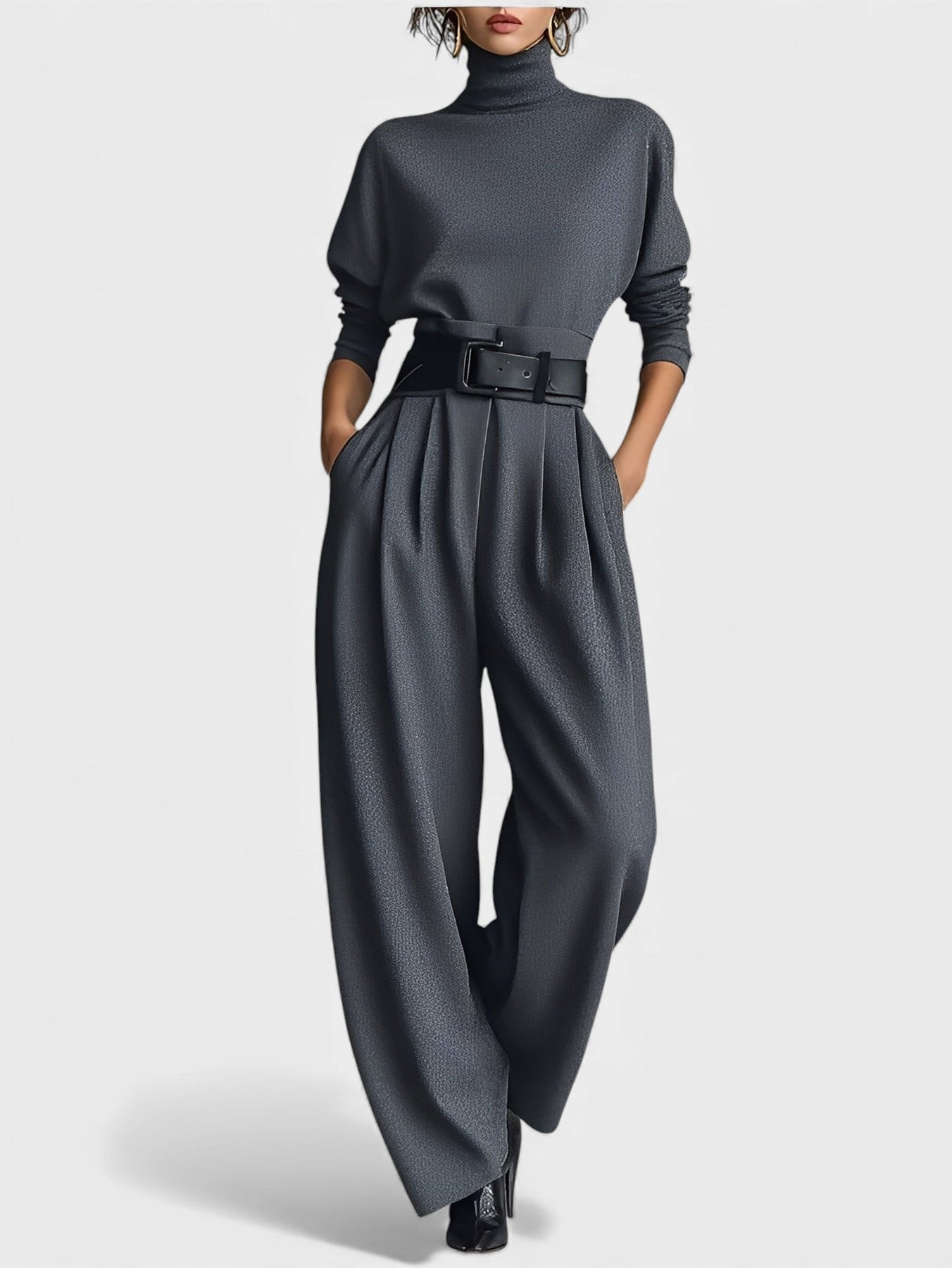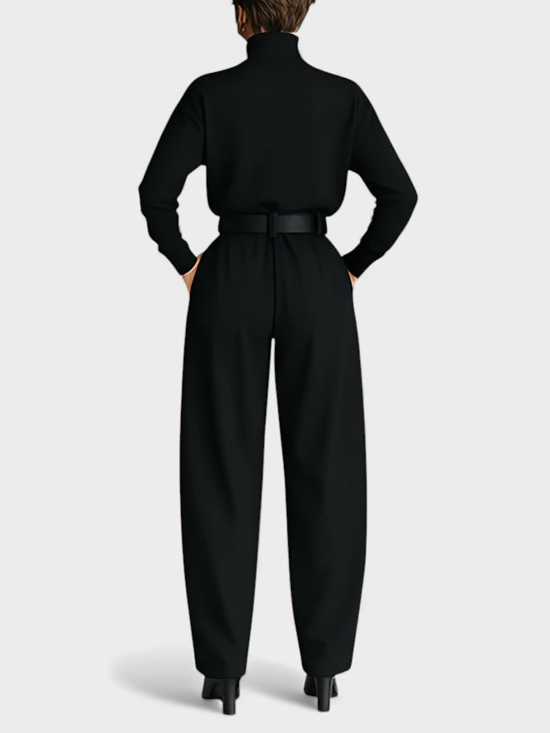 Este conjunto fusiona sofisticación y comodidad en un diseño que destaca por su versatilidad. Con su top de cuello alto y pantalones de corte recto, es la opción perfecta para quienes buscan una prenda que combine estilo y confort sin esfuerzo.