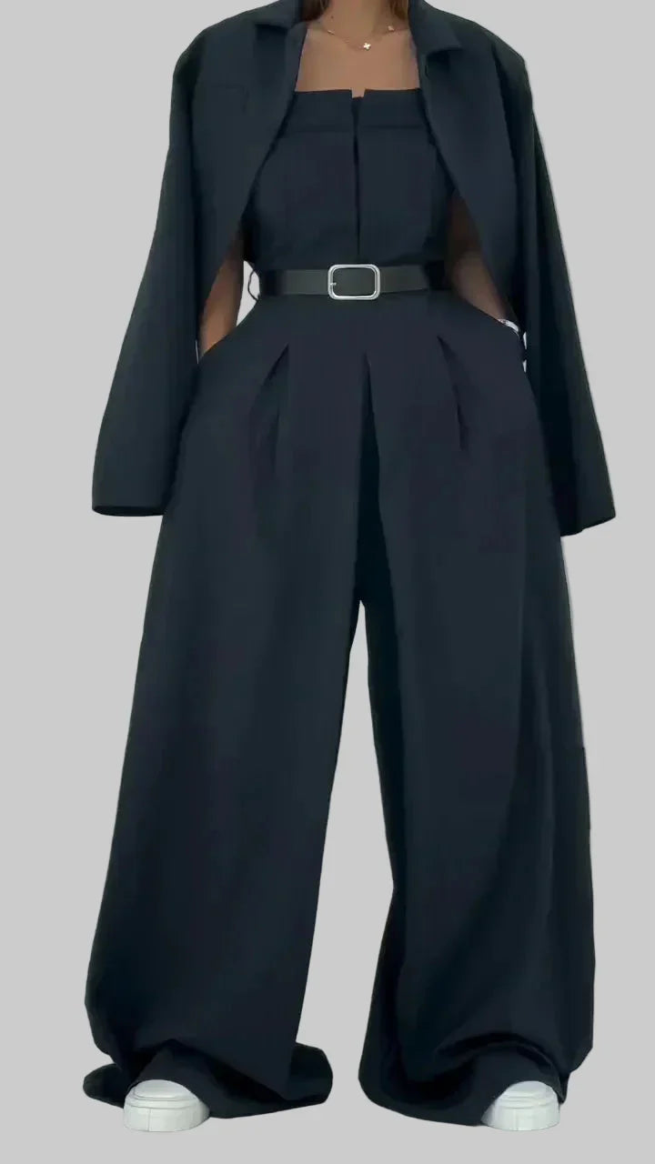 Con unos pantalones ultra modernos y anchos, un bustier estructurado y una chaqueta fluida a juego, ha sido diseñado para resaltar todas las siluetas.