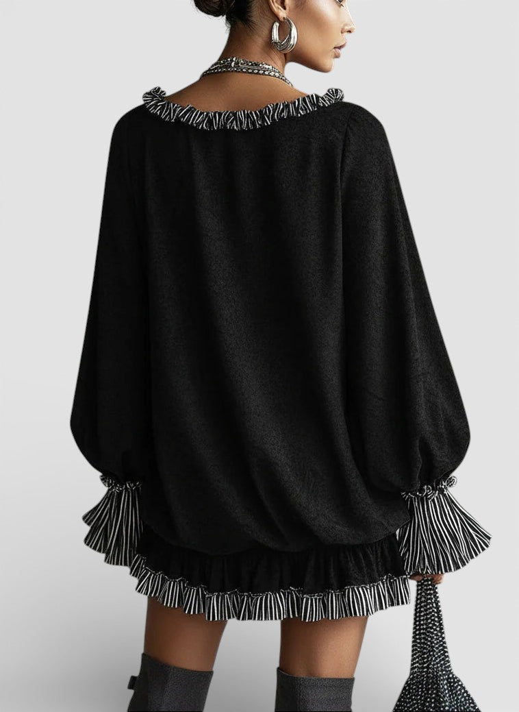 ✔︎ Detalles llamativos – Volantes a rayas en los puños y dobladillo que dan un aire moderno y de moda.