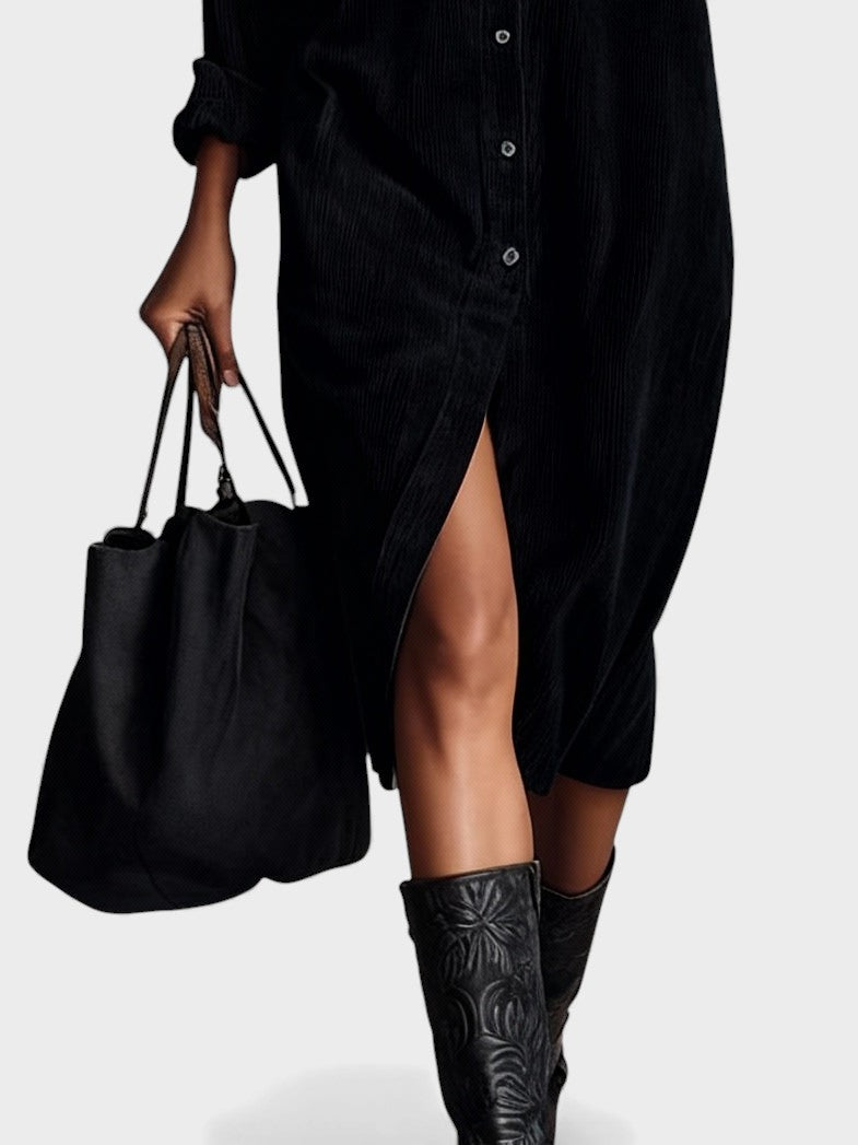 El Vera™ es un vestido midi de pana diseñado para quienes adoran la elegancia relajada. Su tejido suave, su corte holgado y sus detalles clásicos crean un look versátil que funciona en cualquier día de la semana.